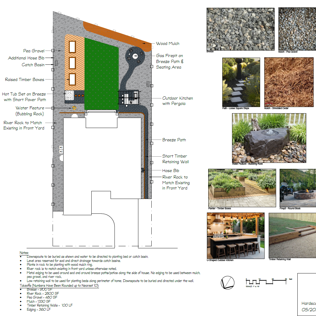 A new build means a blank slate that can be filled with anything and everything. We started the design with their ultimate wish list of an outdoor kitchen, seating area with a fire pit, raised garden beds, and a hot tub. From there, we worked to get a final design that kept true to the original while fitting within their budget.