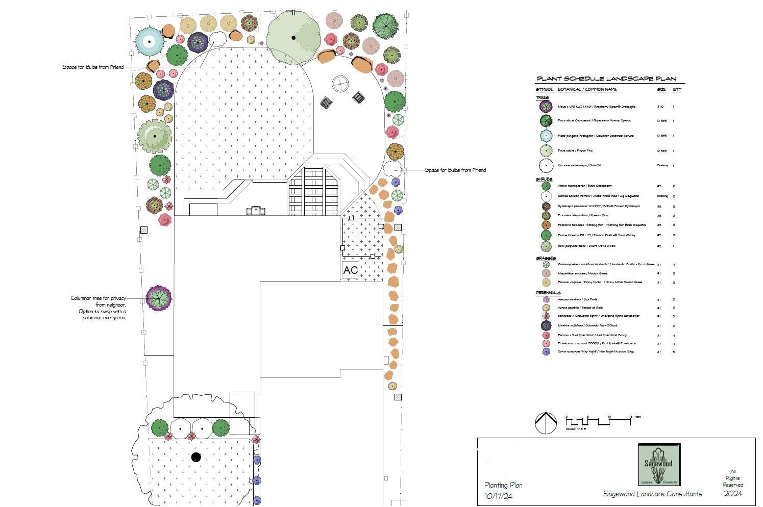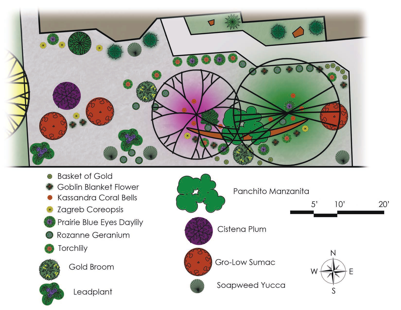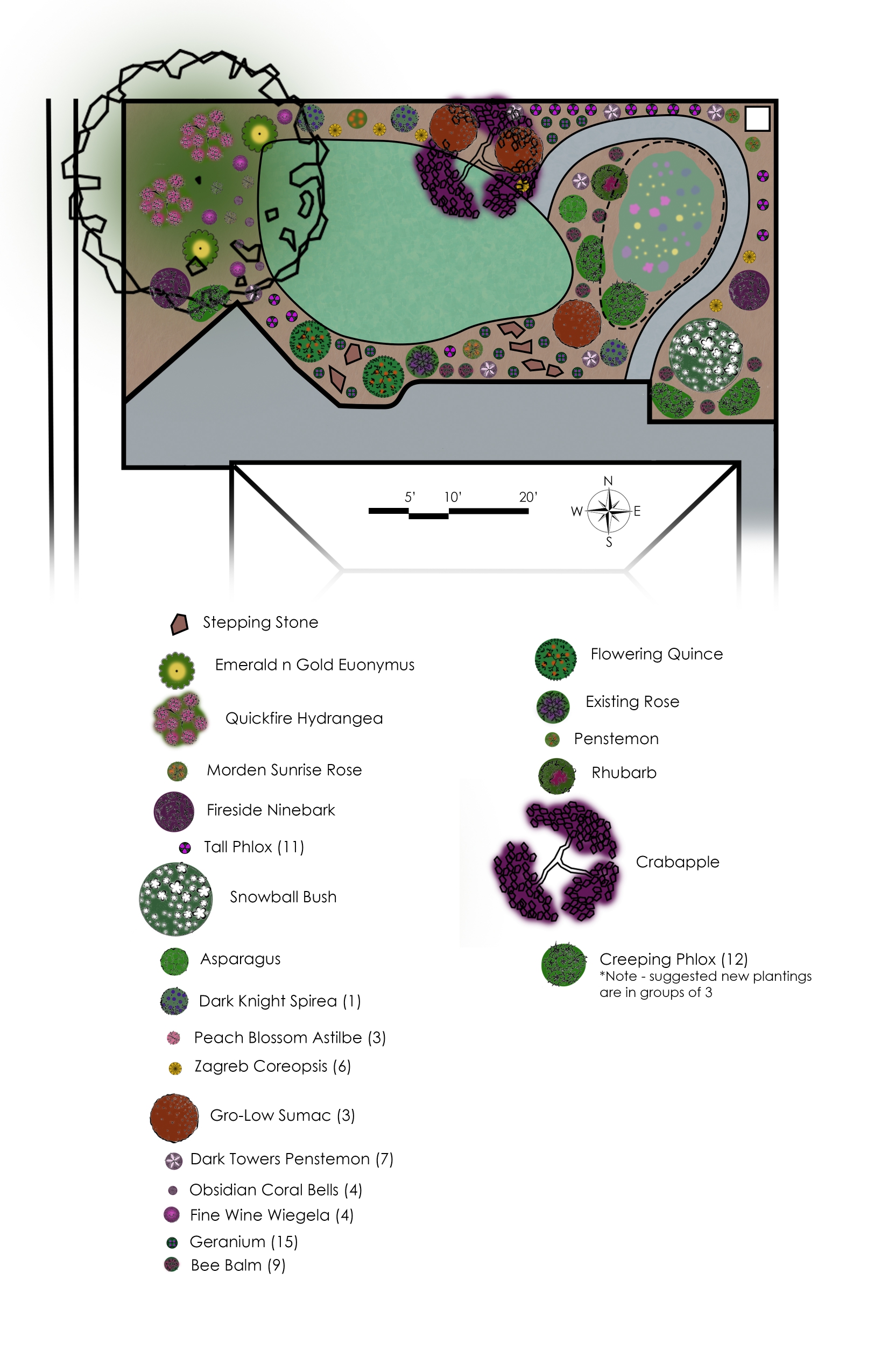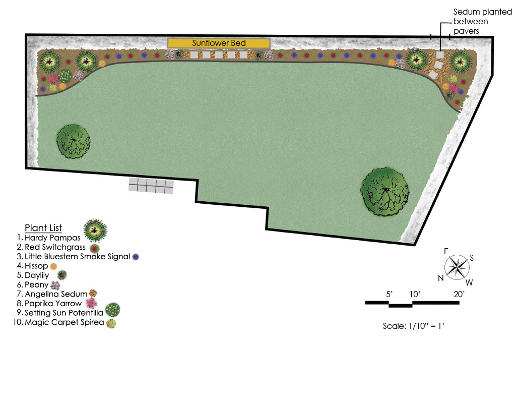 Exposed to the neighborhood by way of a nature path along the backyard fence, the desire for privacy was paramount. A mixed grass border was proposed, sprinkled with small shrubs and flowers in various warm tones to complement the existing sunflower bed.