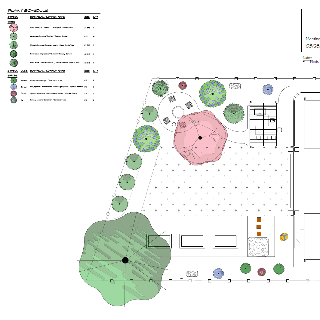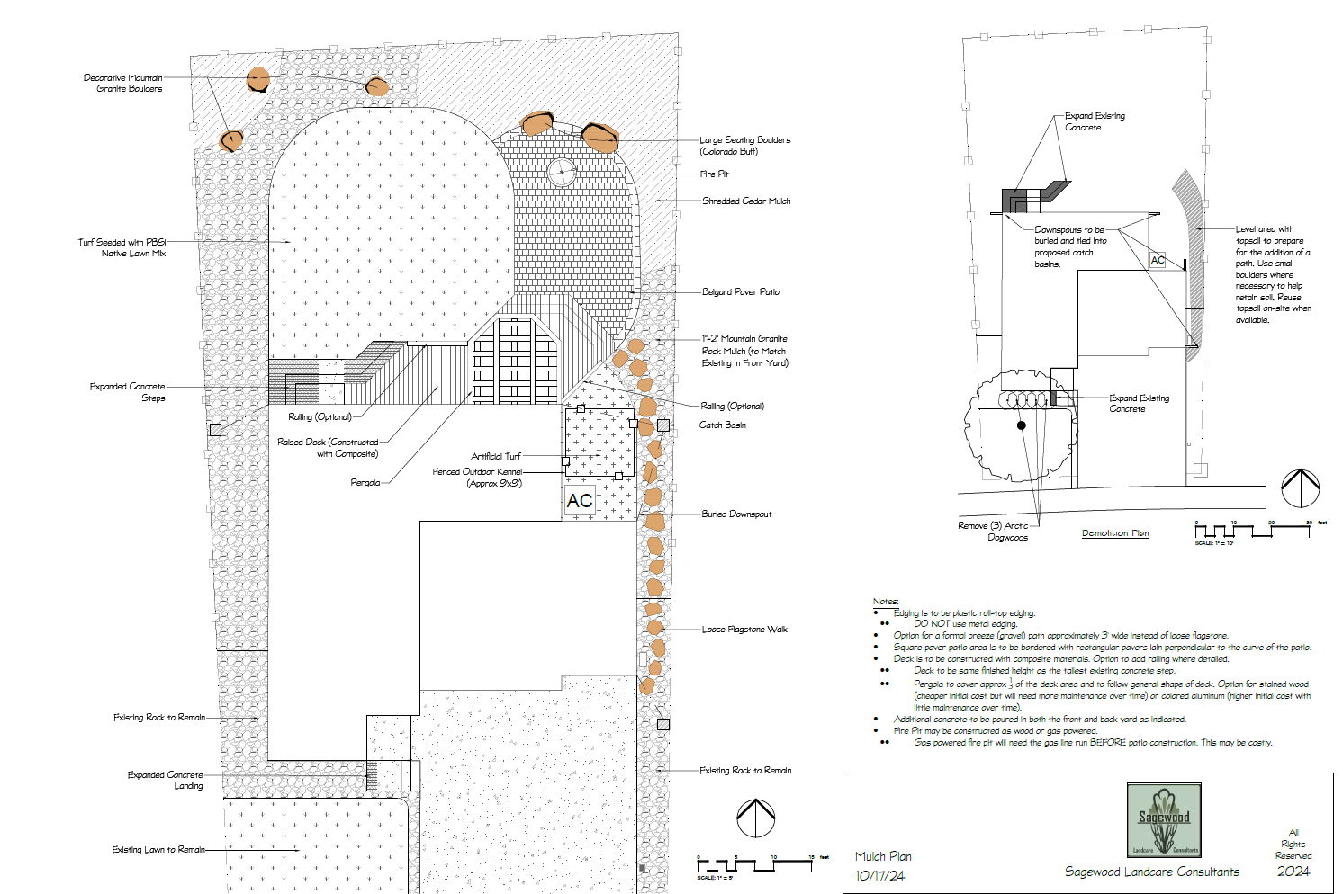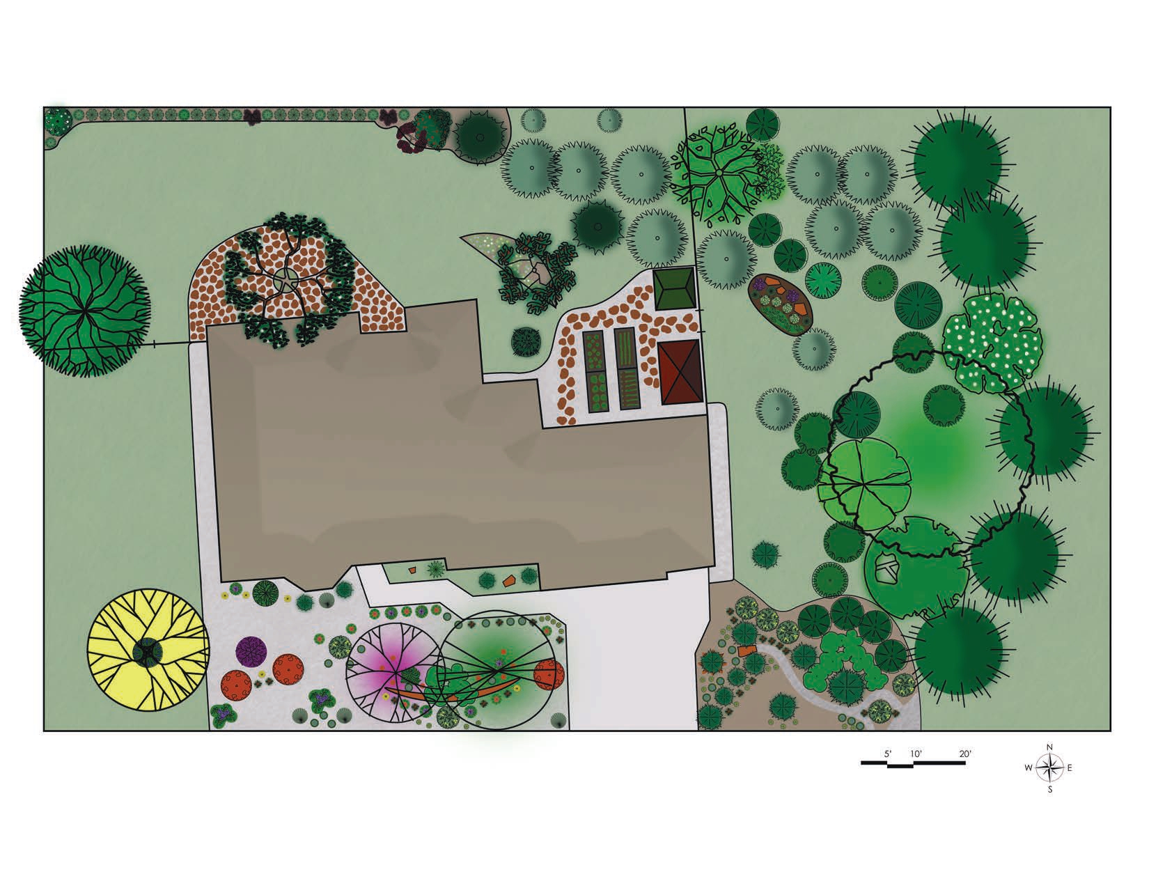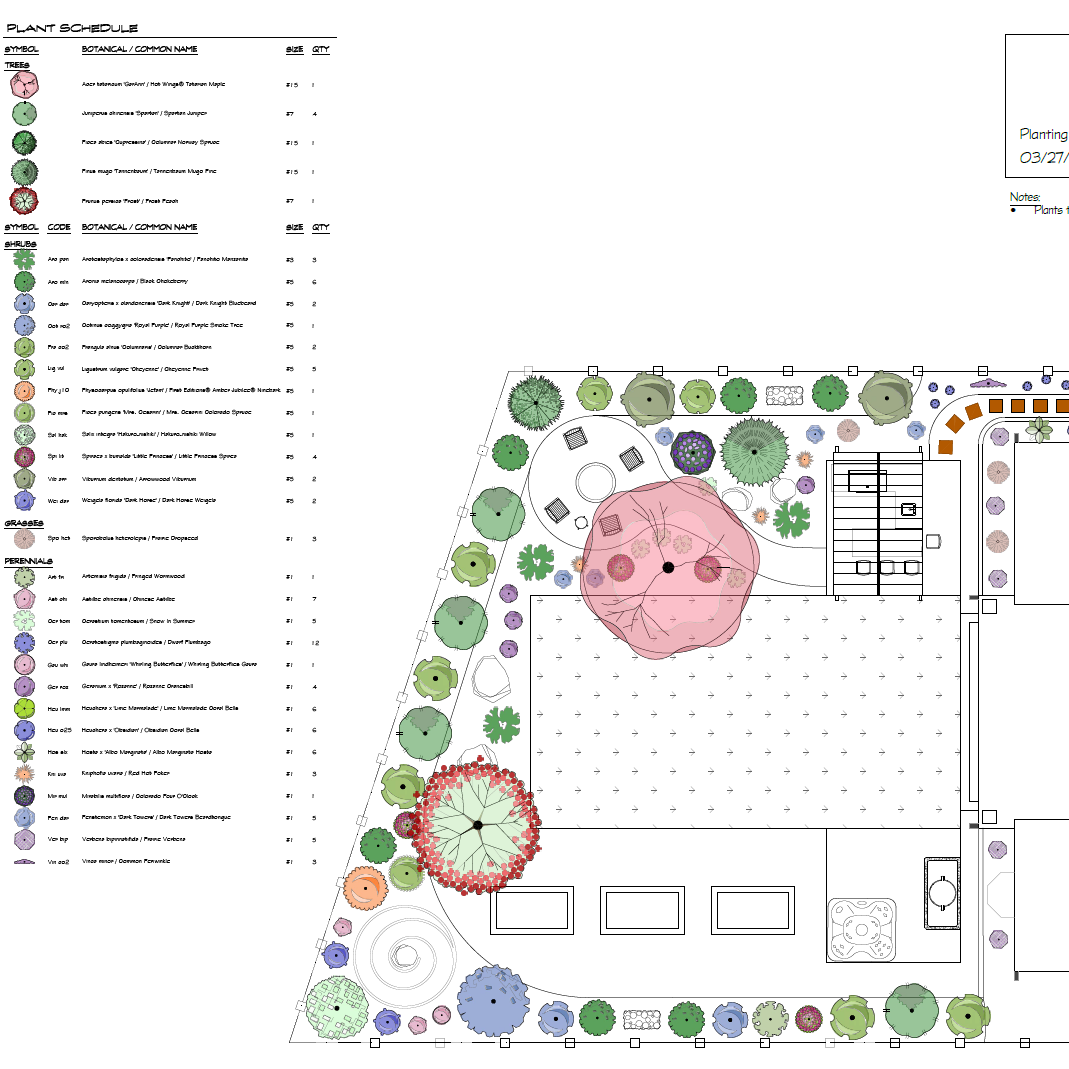 Exposed to the neighborhood by way of a nature path along the backyard fence, the desire for privacy was paramount. A mixed grass border was proposed, sprinkled with small shrubs and flowers in various warm tones to complement the existing sunflower bed.