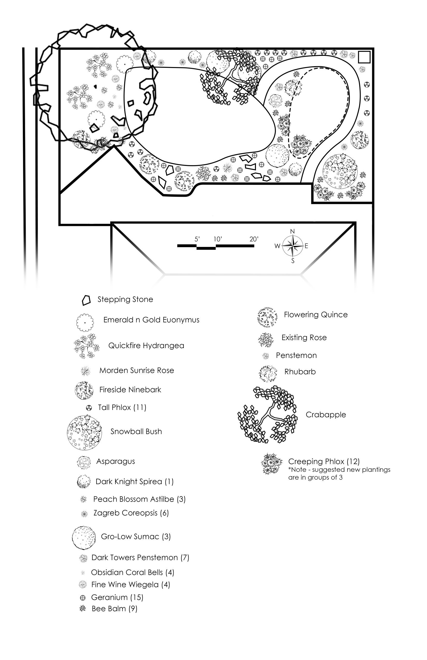 Working within budget restraints, plant selection was curated for optimum volume and pricing. An existing flower garden and walking path served as the backbone for the design, while additional plants were added to supplement year-round color. A large turf area was preserved for the family dog.